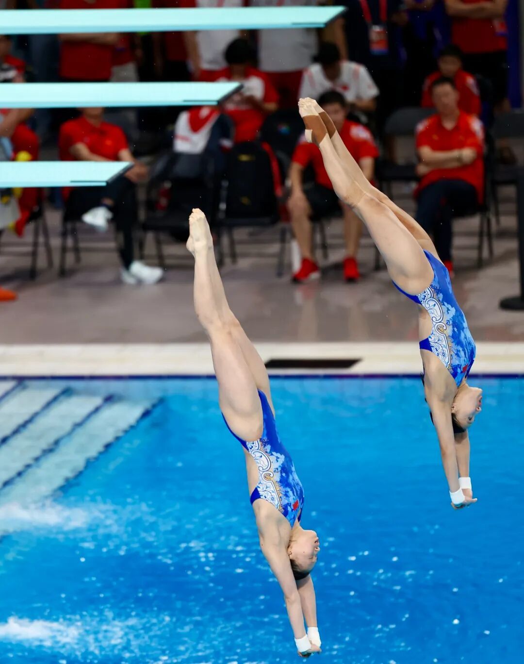 △2025年11月6日,第十五届全国运动会跳水女子双人10米跳台决赛在广东奥体中心游泳馆进行。(图/视觉中国)